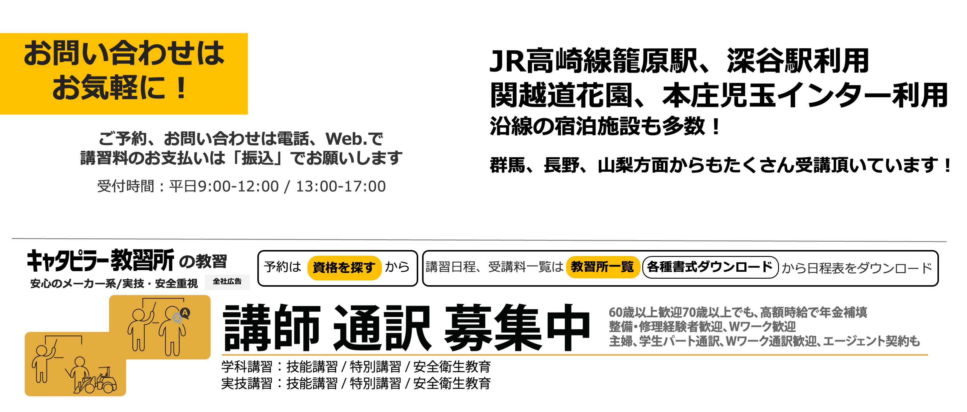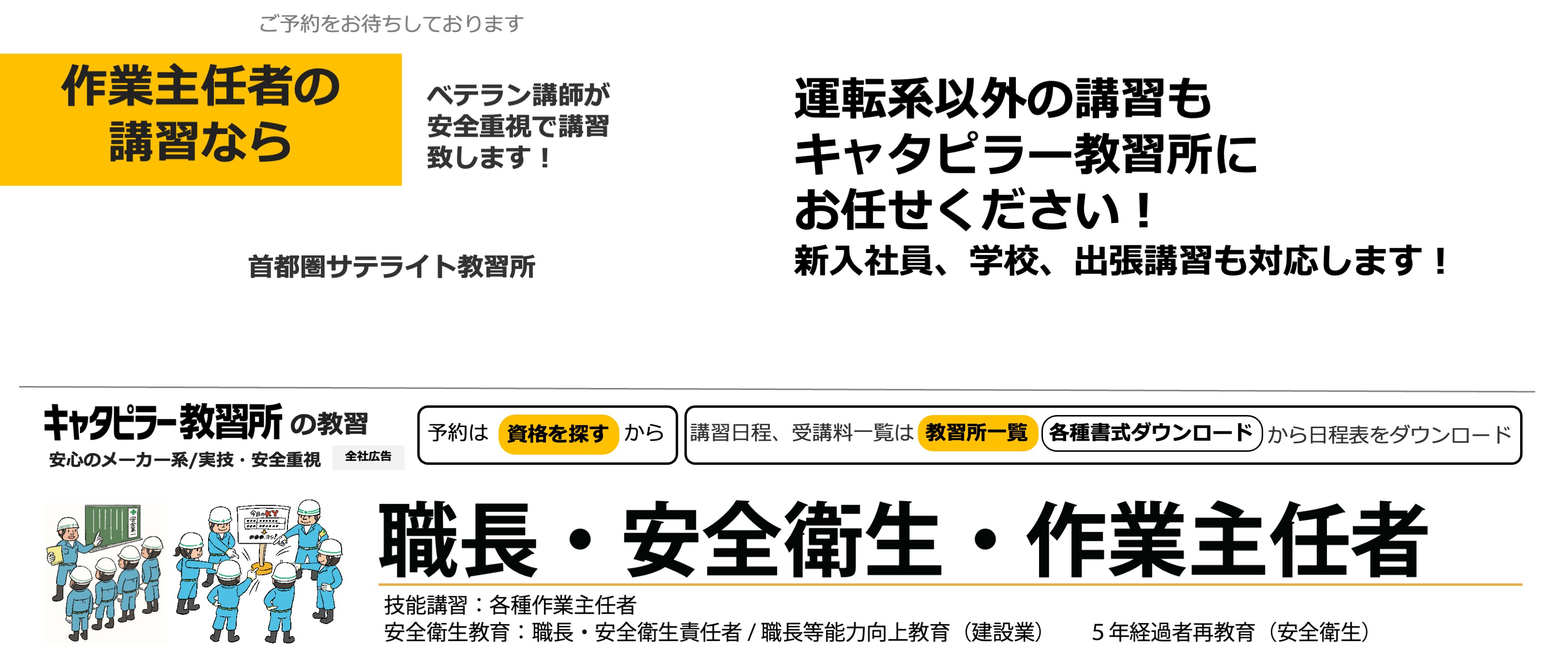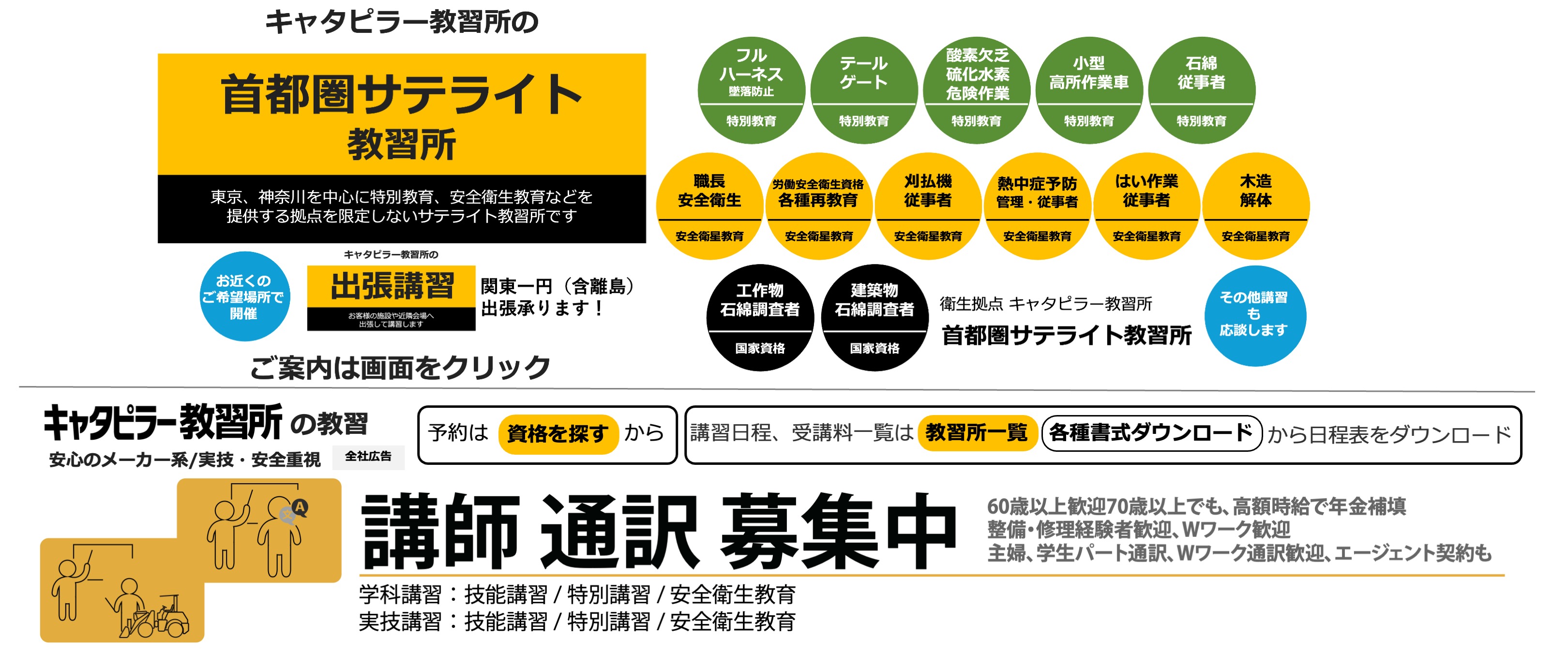 キャタピラー教習所は建機の教習所です(労働局長登録教習機関) 建設機械免許、フォークリフト免許資格、高所作業車免許資格、クレーン免許資格などの技能講習や、フルハーネスなどの特別教育、職長教育などの安全衛生教育を提供します