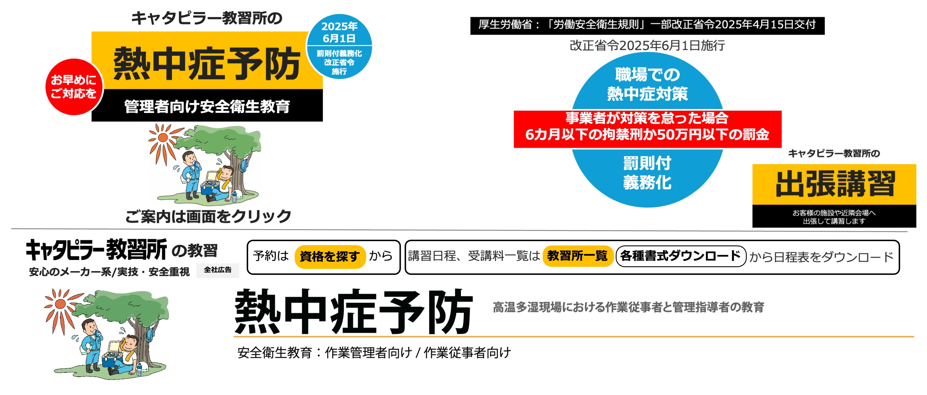 キャタピラー教習所は建機の教習所です(労働局長登録教習機関) 建設機械免許、フォークリフト免許資格、高所作業車免許資格、クレーン免許資格などの技能講習や、フルハーネスなどの特別教育、職長教育などの安全衛生教育を提供します