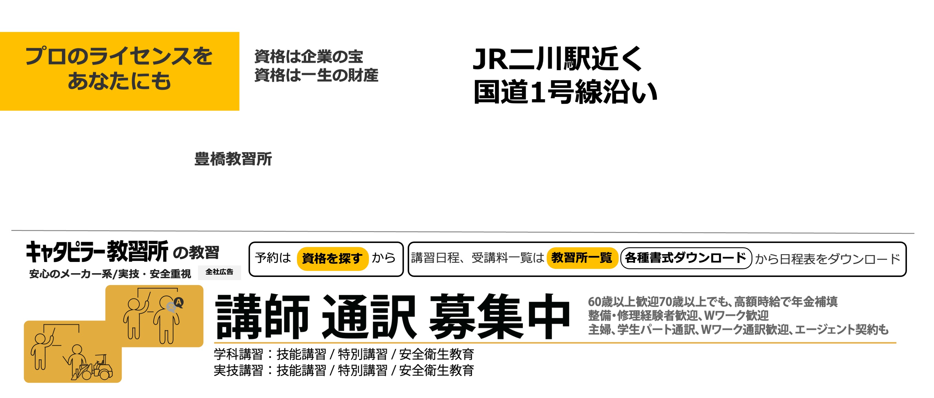 日本キャタピラー豊橋営業所と同居しています。国道1号線沿いで、東海道本線二川駅からのアクセスが便利です。 広い敷地を有し、充実した実技講習を提供しています。ポルトガル講習を開催しており、全国から申込書があります。