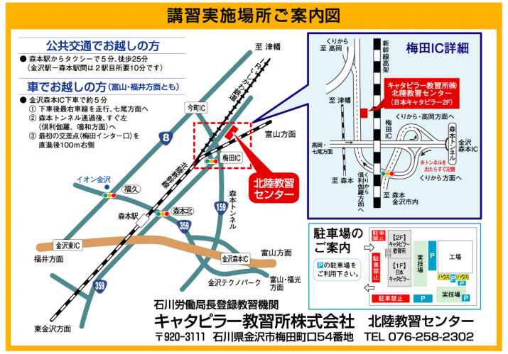 日本キャタピラー石川営業所と同居しています。梅田インターから至近で金沢からのアクセスも便利です。 出張講習にも対応しておりますので、お気軽にお声がけください。