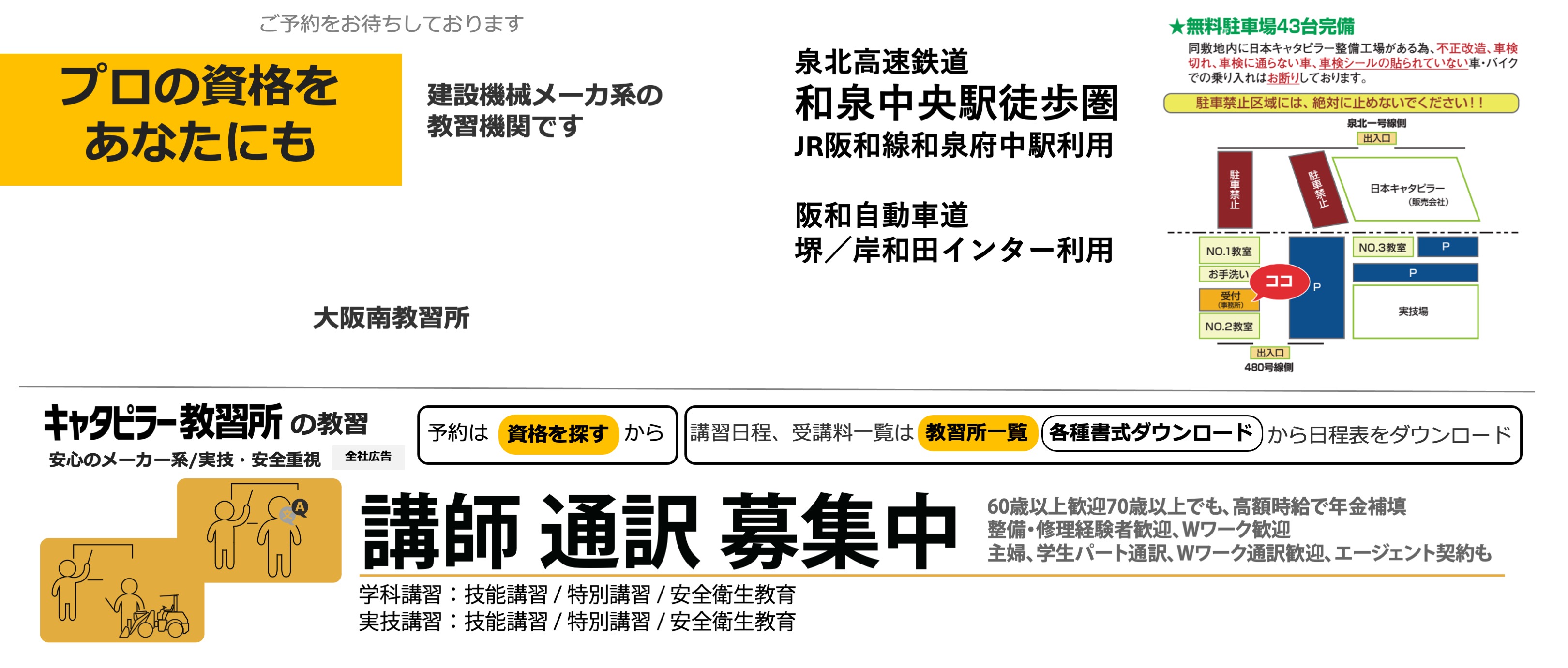 日本キャタピラー大阪南営業所と同居しています。南海電鉄泉北線「和泉中央」駅から徒歩圏内、車も泉北1号線の南端からすぐの場所にあり便利です。 大阪府南部では唯一のメーカー系教習所で実技を重視した講習を提供しています。出張講習にも対応しておりますので、お気軽にお声がけください。